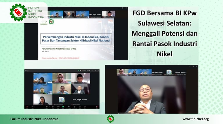 Jakarta, 14 Juli 2025 Ketua Umum FINI, Arif Perdana Kusumah, menjadi narasumber dalam FGD bersama Bank Indonesia Kantor Perwakilan wilayah Sulawesi Selatan. Kegiatan ini bertujuan untuk mendapatkan pendalaman dan berbagi informasi seputar pemetaan rantai pasok komoditas nikel dan juga melakukan assesmen terkait peran dan kontribusi UMKM dalam industri pengolahan/pemurnian nikel. Hasil FGD akan diolah Bank Indonesia untuk menjadi bahan kajian yang bermanfaat bagi industri atau sektor perbankan nasional. Bersama membangun bangsa.